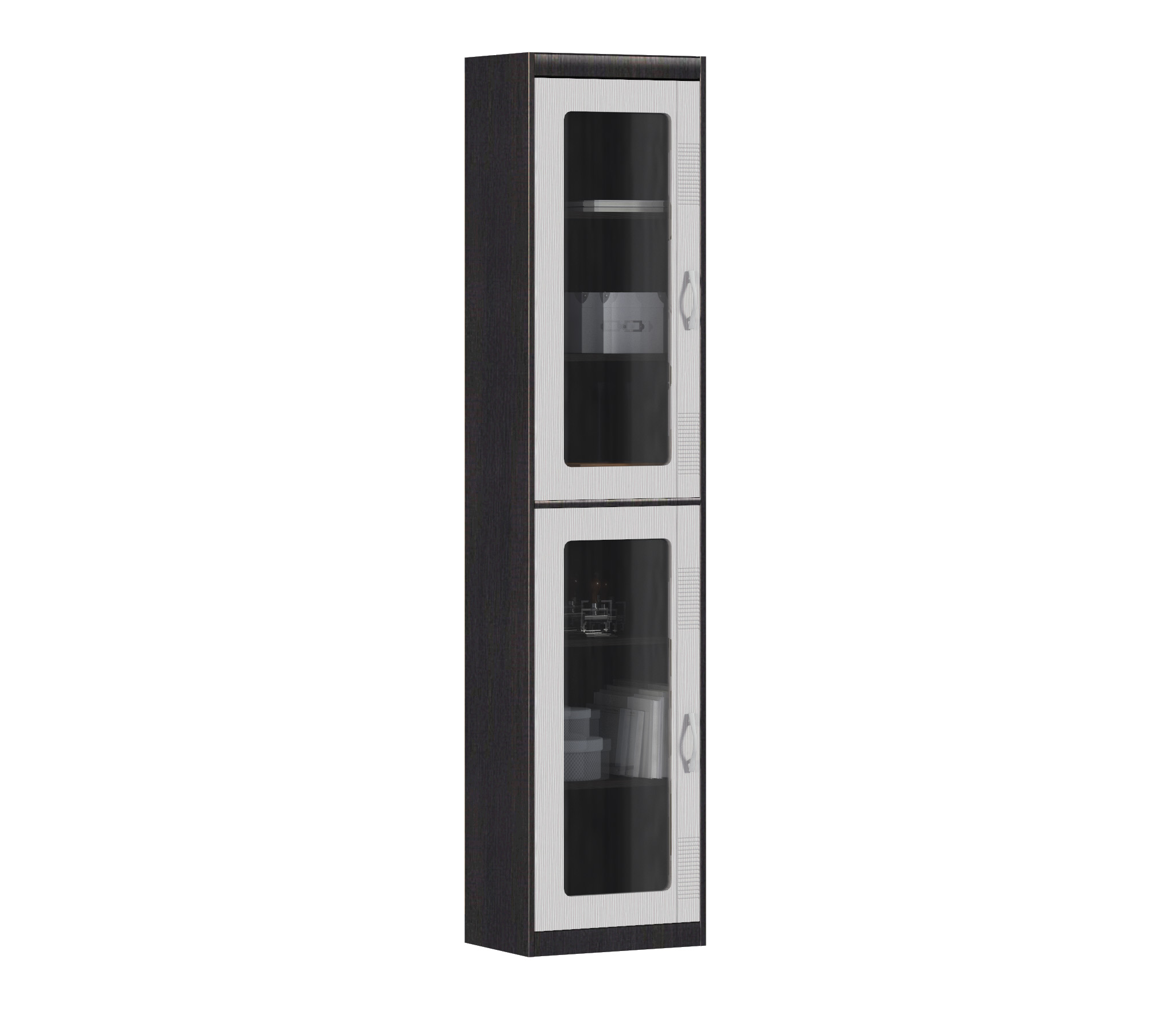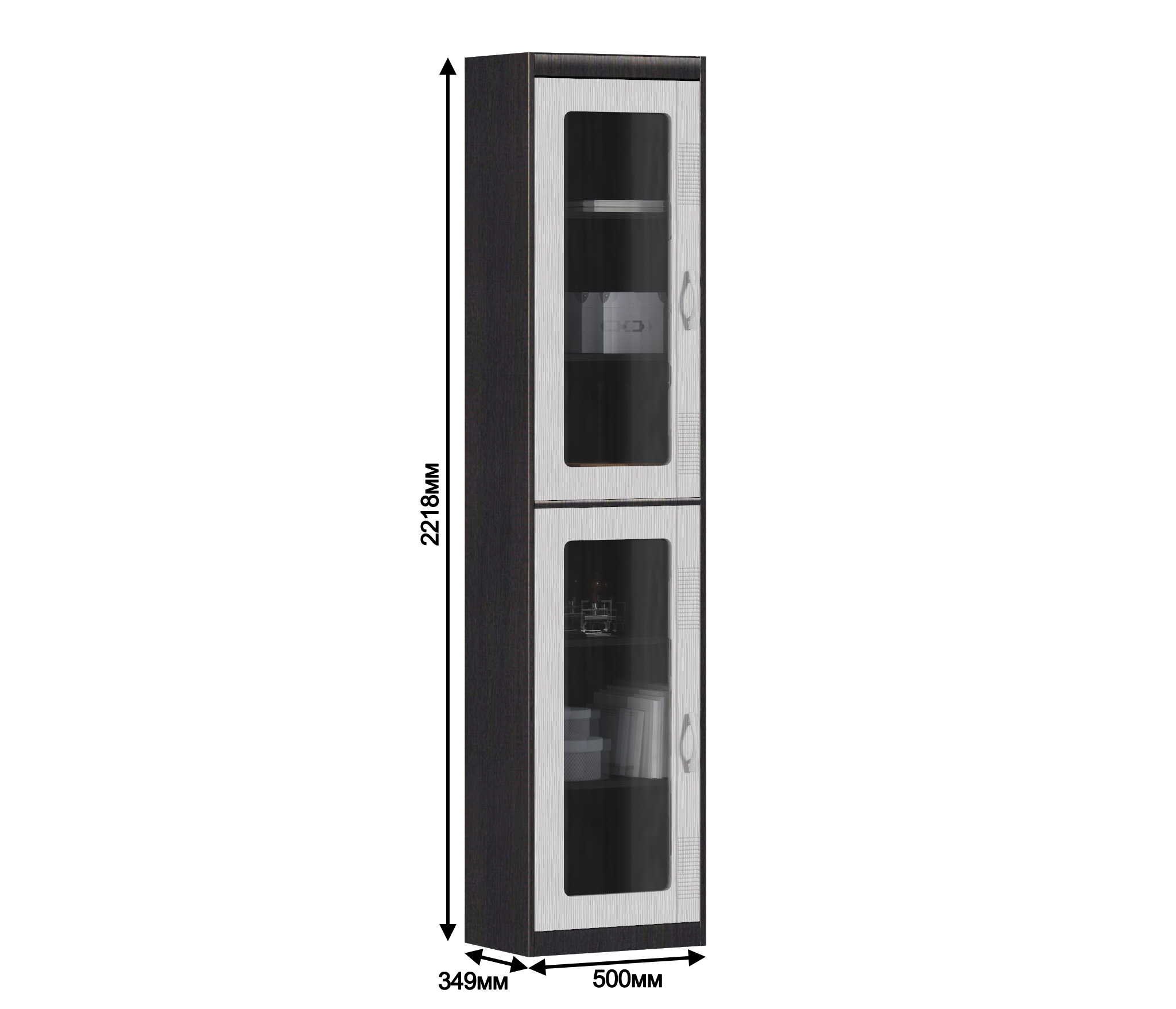 Габаритные размеры витрины Сити СБ-213 – ширина 50 см, высота 221 см и глубина 34 см. Визуально витрину можно разделить на два отделения в каждом из которых по три вместительных полки. Каждое отделение имеет отдельную остекленную дверцу. Выполнена витрина из современного прочного материала. Отделка комбинированная – корпус в цвете «Дуб Феррара», а фасадные поверхности в цвете «Орденс». Витрина может быть отдельным предметом мебели, а может быть стилизована в гарнитур.
