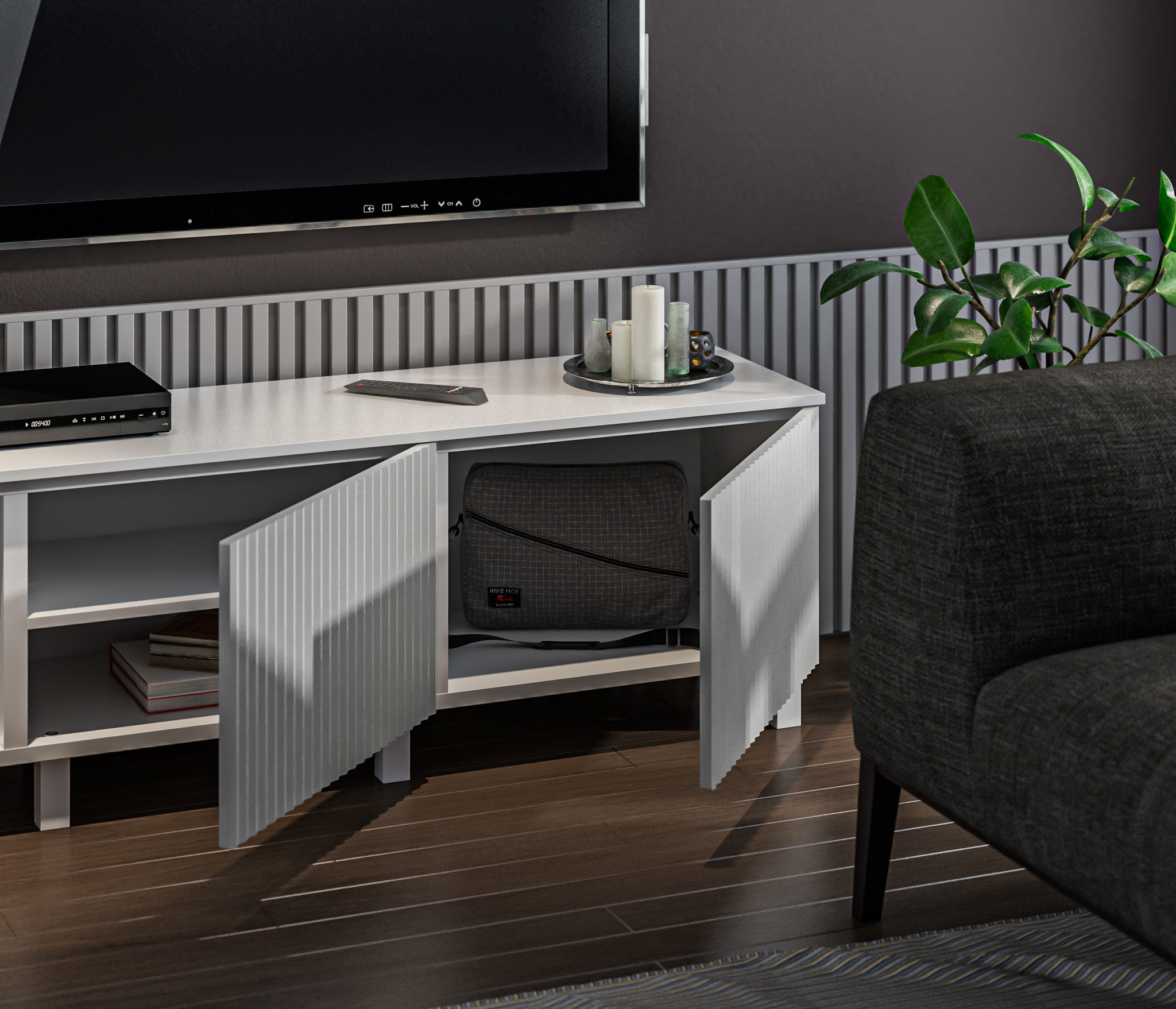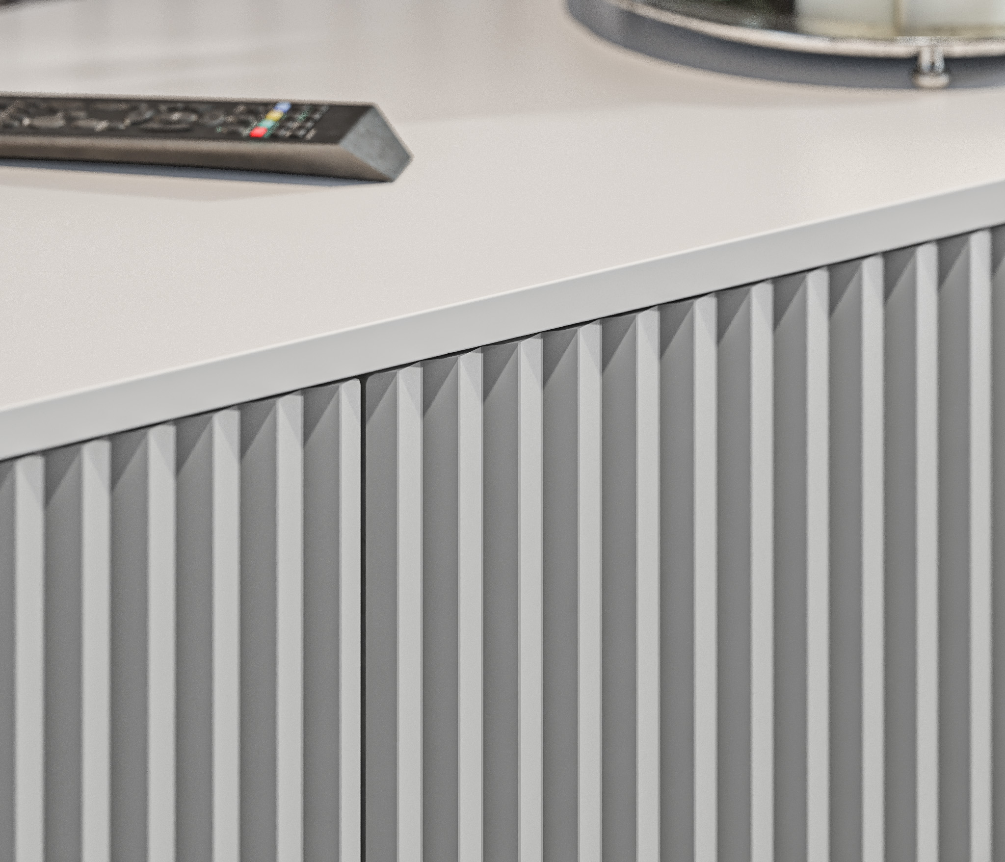 В данной гостиной предусмотрен механизм Push To Open, который подразумевает легкое открытие от нажатия.
