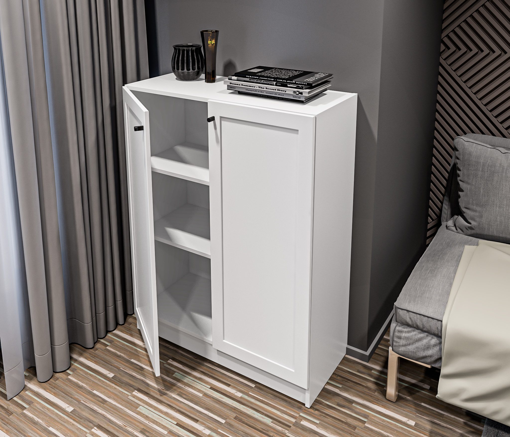 МС Твин предоставляет возможность собрать шкаф или стеллаж по своему вкусу. Вы сами выбираете размеры, цвет ручек: белый или черный, наполнение: ящик или полки. Помимо этого, вы можете решить, оставить фасады глухими или выбрать стеклянные, чтобы добавить прозрачности и легкости в ваш интерьер. Создайте шкаф-стеллаж, который идеально подходит для ваших потребностей и вписывается в ваш стиль.