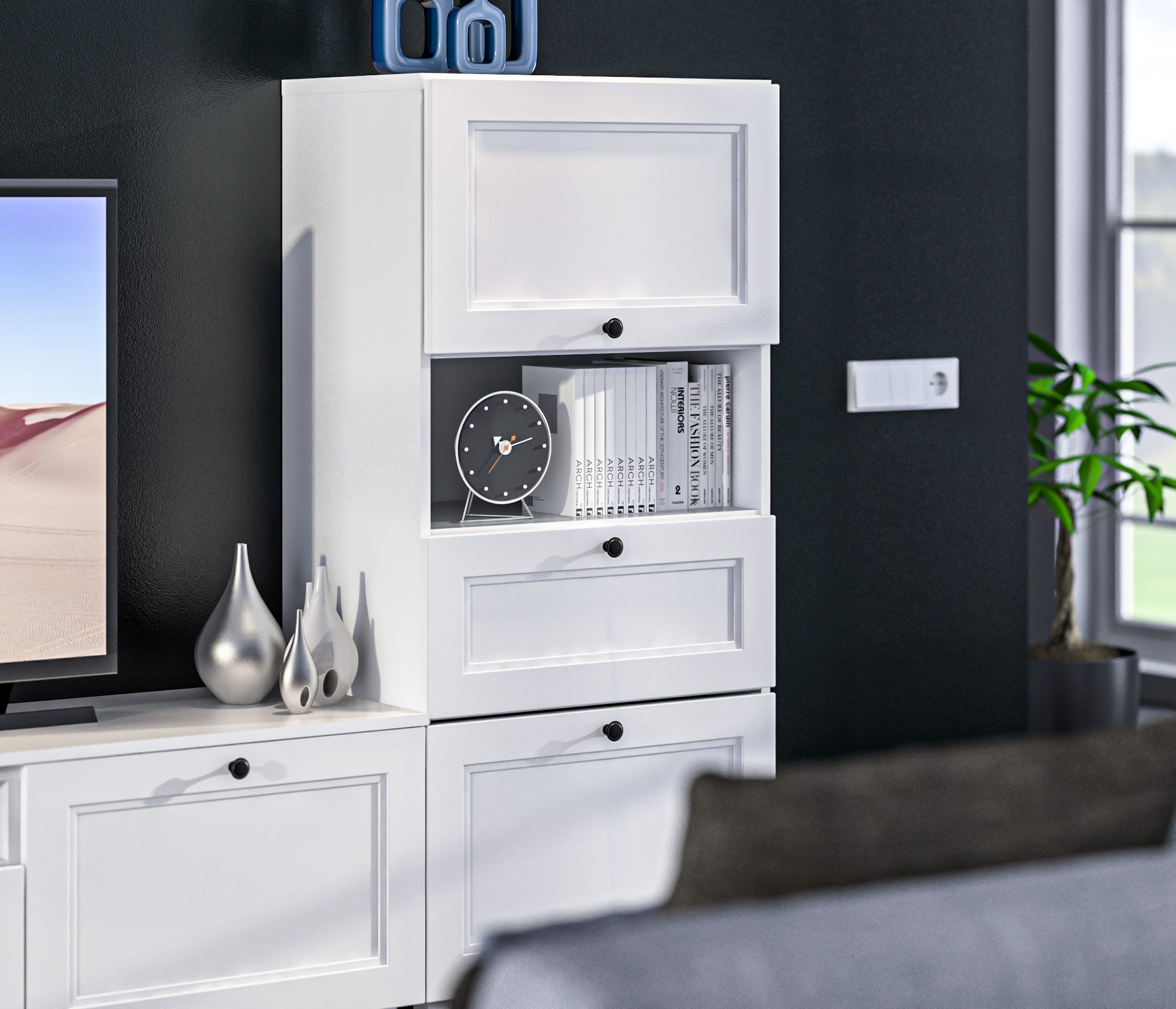 Модульная гостиная Тренд - познакомиться с ней можно в ТЦ Авиапарк (метро ЦСКА, Ходынский бульвар, 4). Огромное преимущество в ней, то, что ее можно собрать из различных модулей, подобрать необходимый Вам размер, а так же выбрать цвет, который несомненно подойдет под Ваш интерьер. Собрать гостиную можно из тумб, полок, и шкафов, а так же выбрать наполнение, можно просто полочки, а можно ящики :) И еще, несомненный плюс - ее можно повесить на стену, или поставить на ножки, выбор остается за Вами. Приходите в гости, наши менеджеры покажут Вам все варианты исполнения, и помогут подобрать необходимый для Вас вариант!