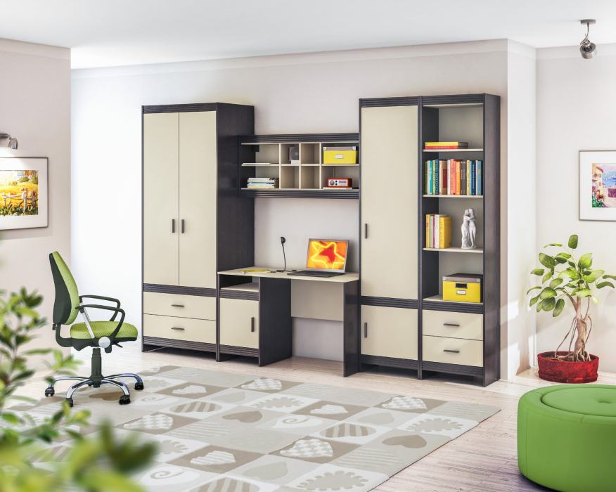 Современный комплект функциональной мебели, рассчитанный на комнату, предназначенную для проживания ребенка или подростка. Комплект включает в себя удобный компьютерный стол, вместительный шкаф для одежды, два модуля разной конфигурации для хранения всех необходимых вещей, навесную секцию с удобными полками. Приятный дизайн, который только подчеркивает выбранное цветовое сочетание: Венге/Ваниль.