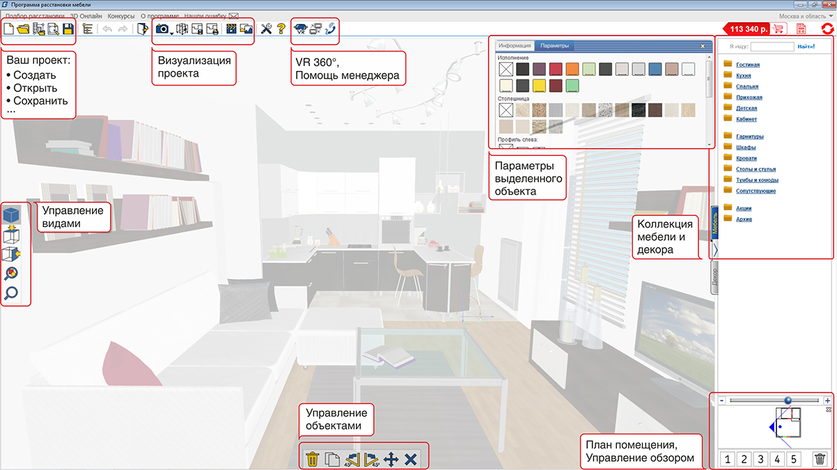 При зажатии правой кнопки мыши с одновременным перемещением указателя, происходит выделение сразу нескольких позиций мебели; например, таким образом легко сменить цвет у группы объектов со схожими параметрами;
